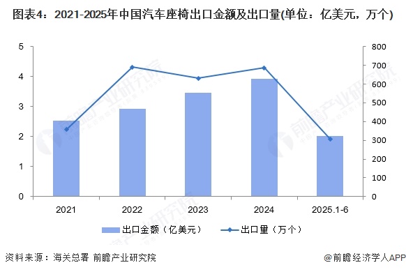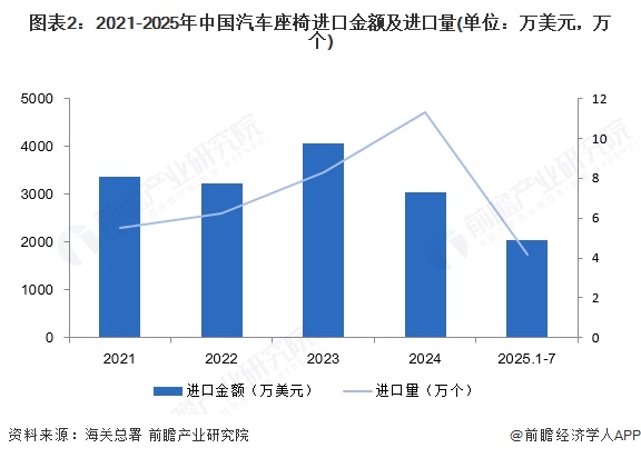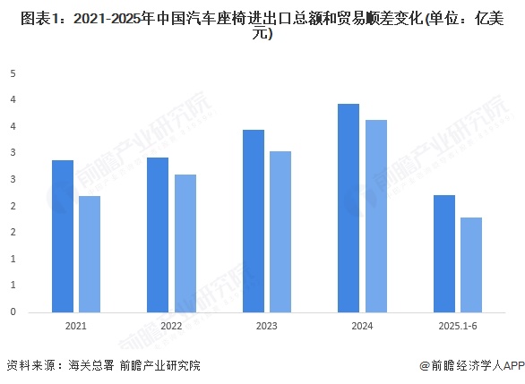 与2023年相比,2024年汽车座椅进出口总金额有所增长,为4.23亿美元,同比增长9.8%。其中进口金额为3037.41万美元,出口金额为3.93亿美元,实现贸易顺差3.63亿美元。2025年1-6月,中国汽车座椅进出口总金额和贸易顺差分别为2.21亿美元和1.80亿美元。