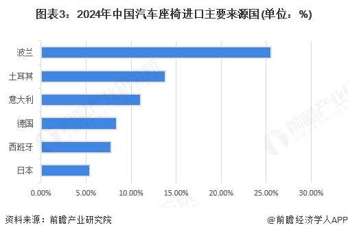 汽车座椅主要进口来源国家或地区有波兰、土耳其、意大利、德国、西班牙等,其中2024年从波兰进口的汽车座椅金额为774.9万美元,占当年进口总金额的比重为25.51%;土耳其位居第二,进口金额为419.0万美元,占比13.79%;从意大利进口金额为336.3万美元,占比11.07%;其余国家的进口金额占比均不超过10%。