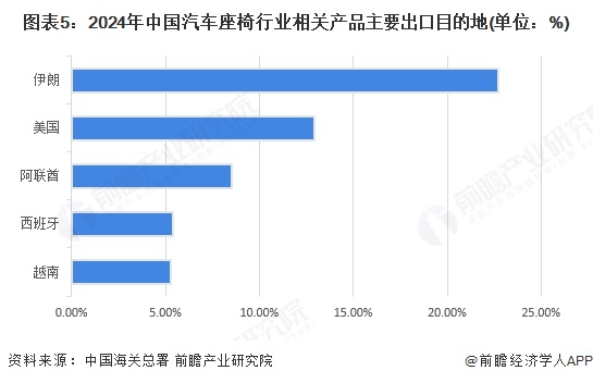 汽车座椅行业相关产品主要出口目的地为美伊朗、美国、阿联酋、西班牙、越南等,其中2024年出口伊朗的汽车座椅相关产品金额为8921万美元,占当年汽车座椅出口总金额的22.72%;其次是美国,出口金额为5084.5万美元,占比为12.95%;其余国家的出口金额占比均不超过10%。